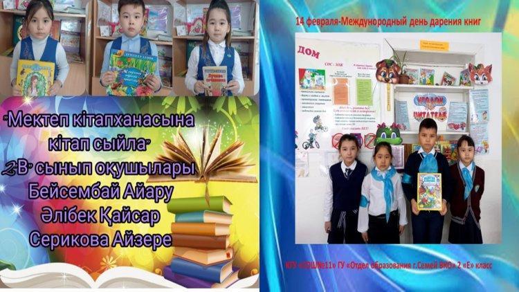 «Оқуға құштар мектеп – оқуға құштар ұлт» республикалық жобасы, «Оқу – жетістікке жету жолы» мектепішілік жоба аясында ШҚО ББ Семей қаласы бойынша ББ «№ 11 ЖОББМ» КММ кітапханасында «Мектеп кітапханасына кітап сыйла» акциясы 14 ақпан – Халықаралық кітап сыйлау күніне орай ұйымдастырылып, акция барысында 0-4 сынып оқушылары мен ата-аналары, ұстаздар кітапханаға кітаптар сыйлады.