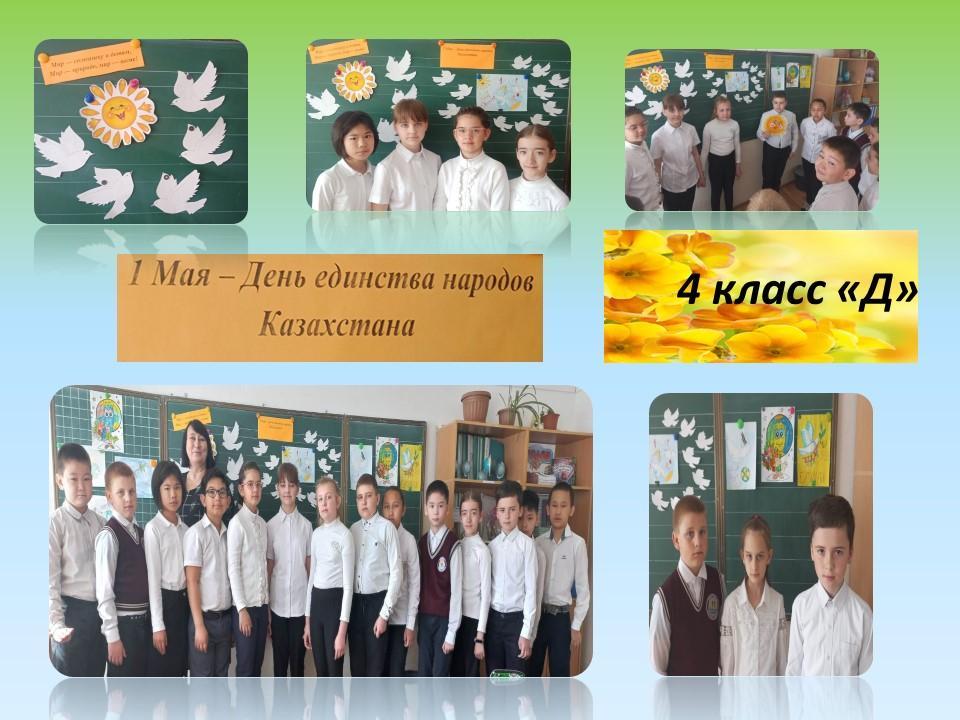 Ну, вот, наконец, и приближается майская пора- время тепла, солнышка и хорошего настроения. С 25 апреля начинается неделя мероприятий, посвященных празднованию 1 мая-дню единства народа Казахстана. В первый же день, классные руководители провели со своими классами тематические классные часы с презентациями, видеороликами, рисунками и иллюстрациями, с целью формирования у учащихся казахстанского патриотизма посредством культурного наследия народов Казахстана.