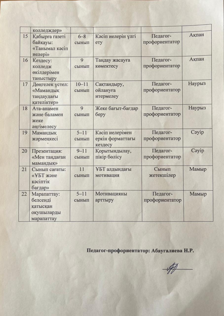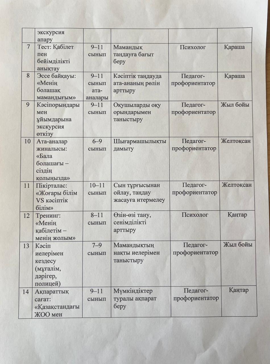 2025-2026 оқу жылына арналған кәсіптік бағдар беру жұмысының жоспары » Средняя общеобразовательная школа № 11
