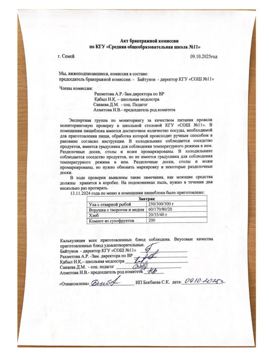 АКТ бракеражной комиссии » Средняя общеобразовательная школа № 11