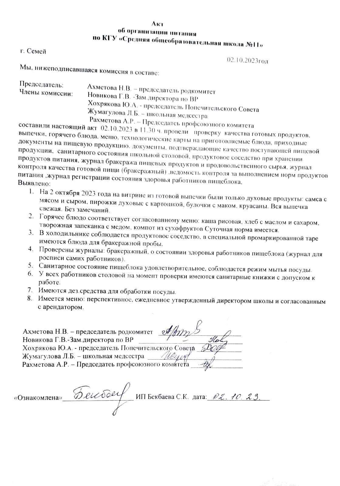 Акт об организации питания » Средняя общеобразовательная школа № 11